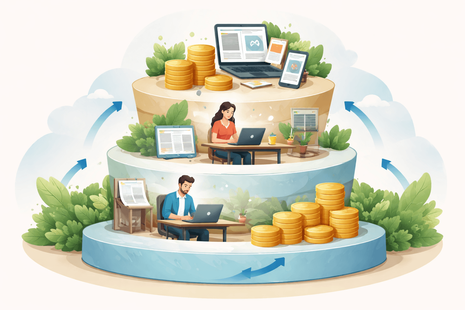 The third layer is scalable income, which includes digital products, content, or other assets that can grow without requiring proportional time investment.